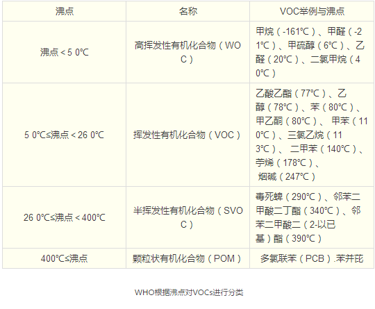 目前最常見的是WHO(世界衛生組織)規定的分類方法,它根據沸點對VOCs進行了分類。根據WHO定義,揮發性有機化合物(VOC)是指在常溫下,沸點50℃—260℃的各種有機化合物。